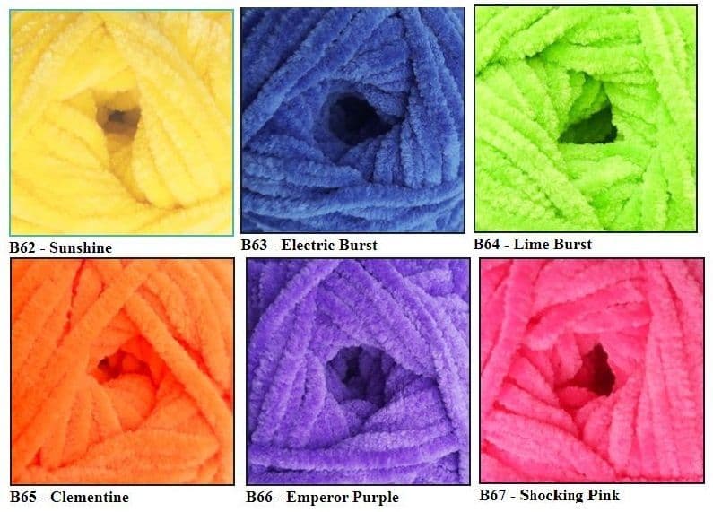 This super-soft yarn comes in a range of bright shades, including both solid colors and dotty patterns