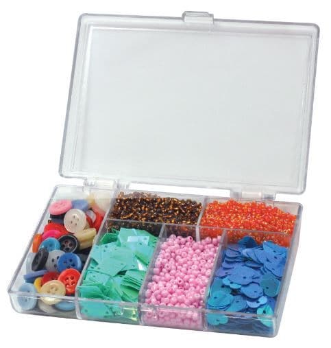 Beads and Buttons Organiser with 6 compartments - Ideal for beads, buttons, jewellery accessories, and more. LxWxH: 8.5 x 11.7 x 2.2cm.